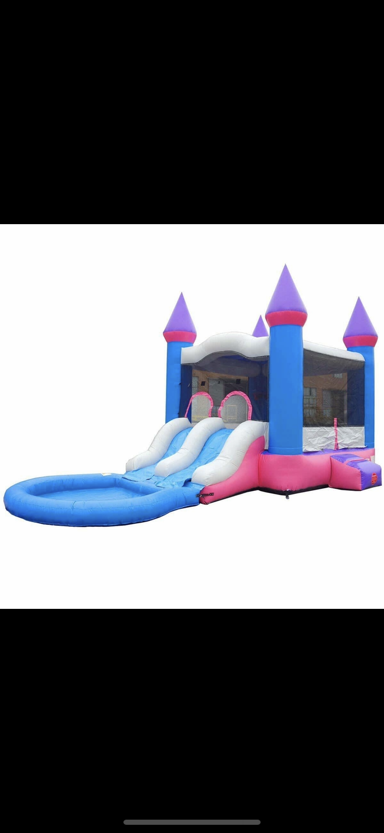 Pink castle has double slides thats can be used wet with pool or dry without pool. To use wet you must provide your own water hose to connect with the hose attached to the bouncer . WE DO NOT PROVIDE WATER.